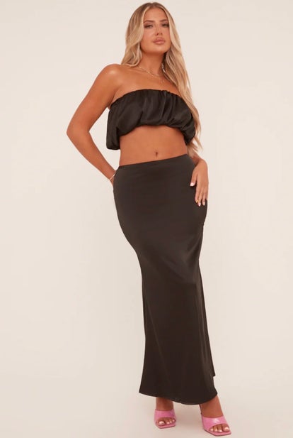 Step with style in this satin puffball bandeau top and maxi skirt co-ord.